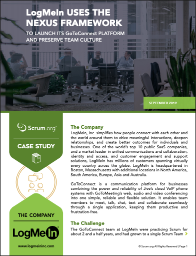 To launch GoToConnect, LogMeIn scaled with the Nexus framework—enabling multiple teams to deliver together while preserving the strong team culture built through Scrum.